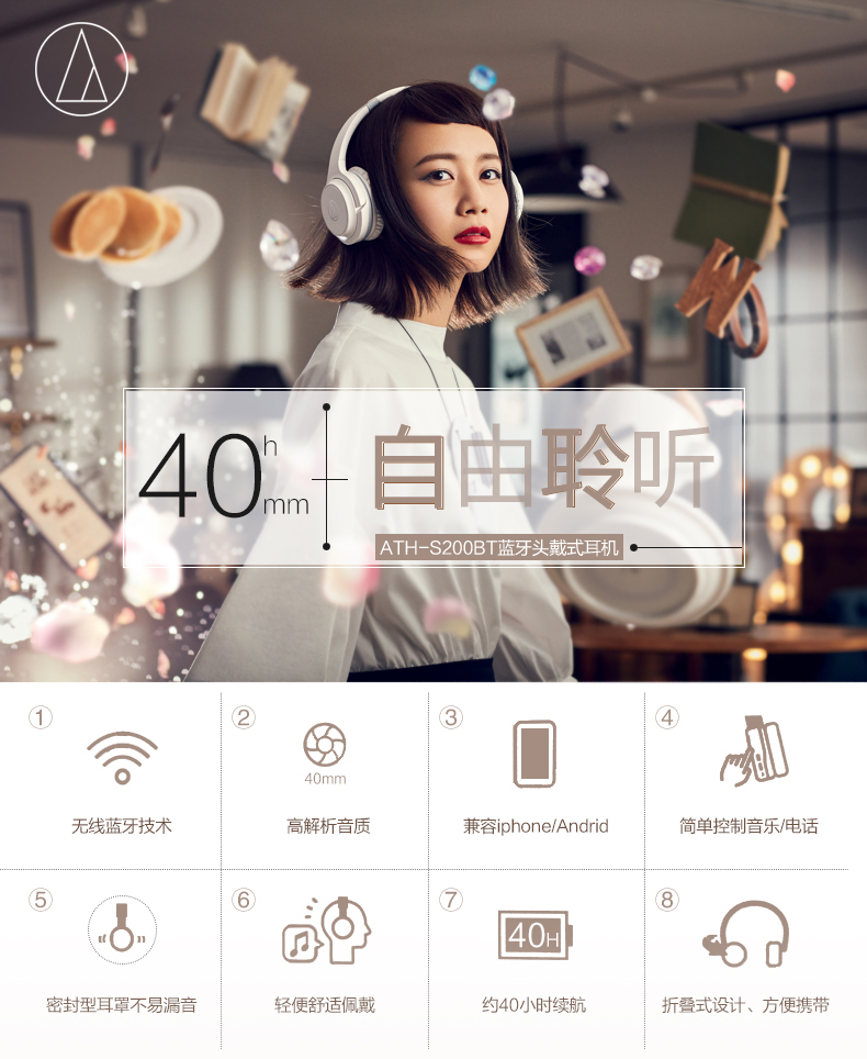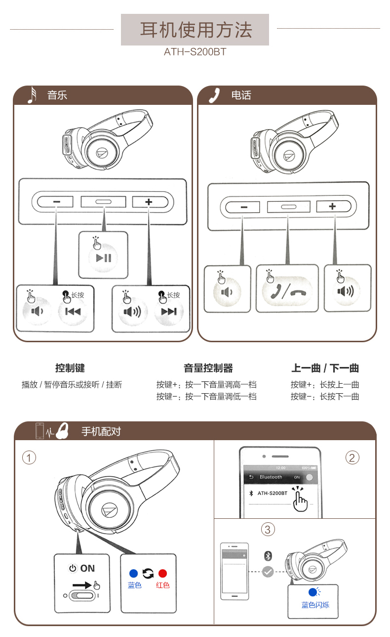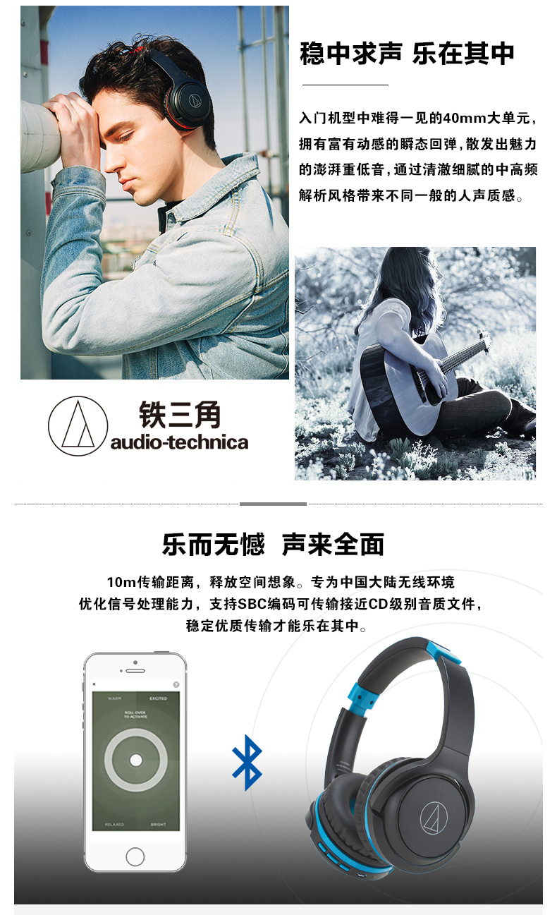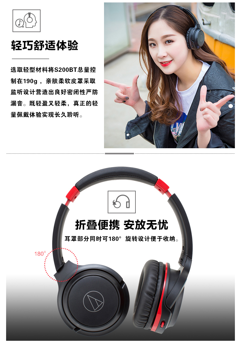 商品名称:Audio Technica/铁三角 ATH-S200BT 音乐头戴式耳麦无线蓝牙耳机
