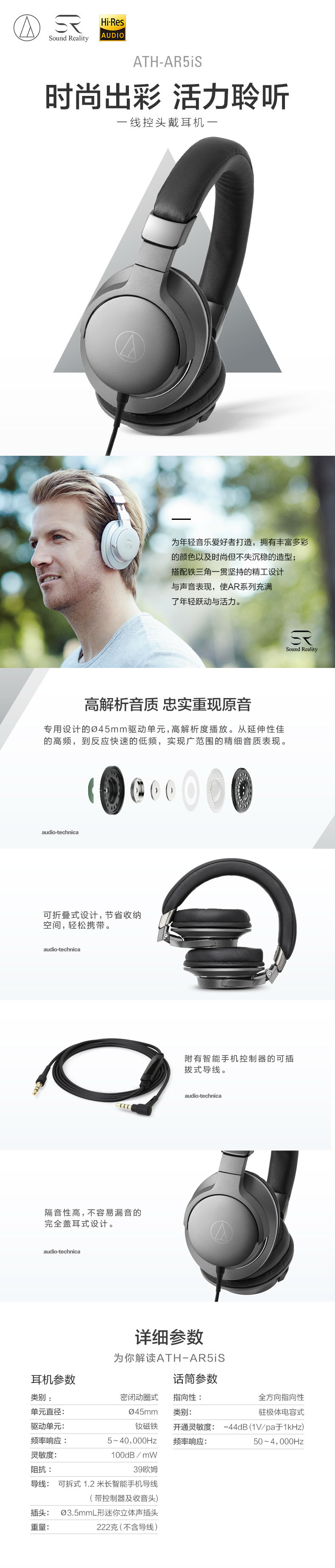 产品名称:Audio Technica/铁三角 ATH-AR5iS