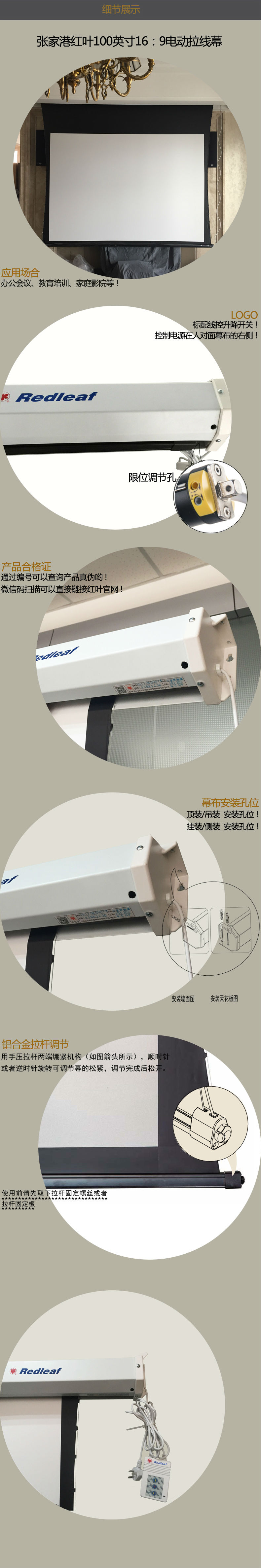 商品名称:Redleaf红叶电动投影仪幕布84寸92寸100寸16:9高清纳米3D4K电动拉线白软幕灰塑软幕金属幕家庭影院电动幕