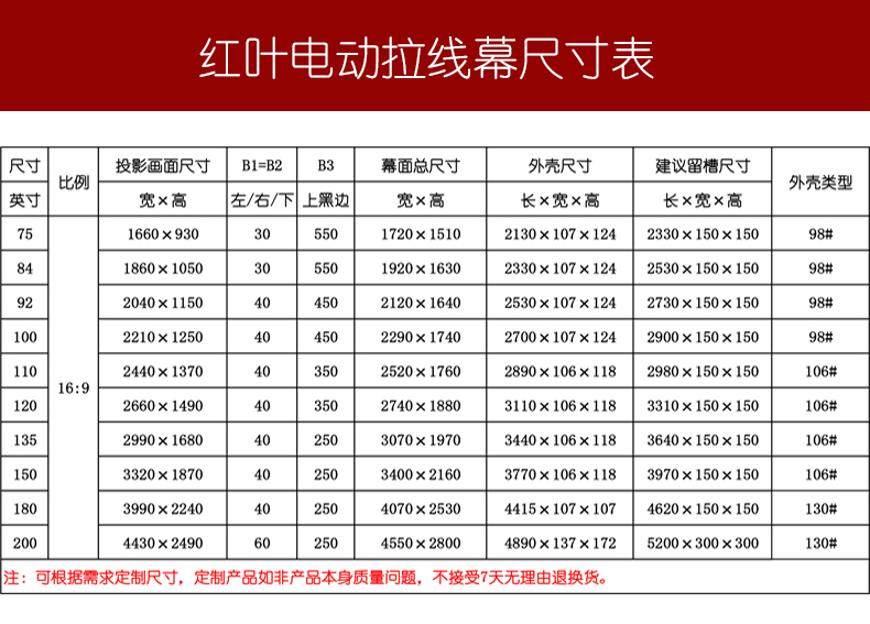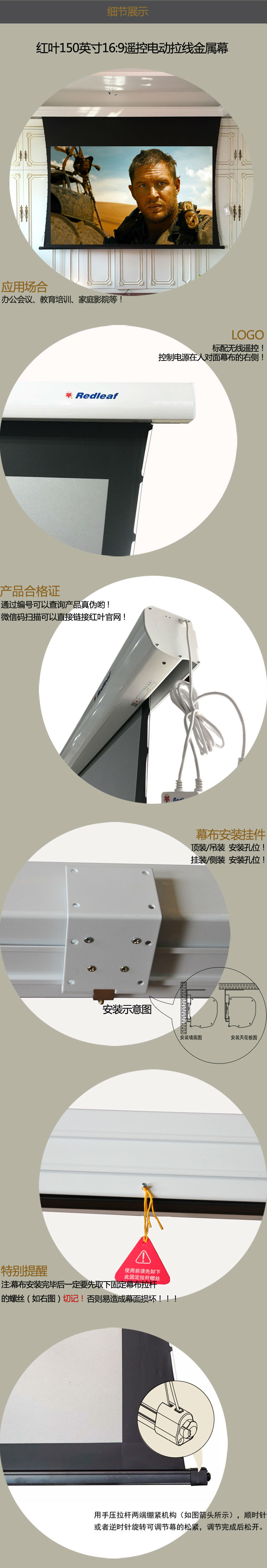 商品名称:Redleaf红叶电动投影仪幕布110寸120寸135寸150寸16:9高清纳米3D4K电动拉线白软幕灰塑软幕金属幕家庭影院幕