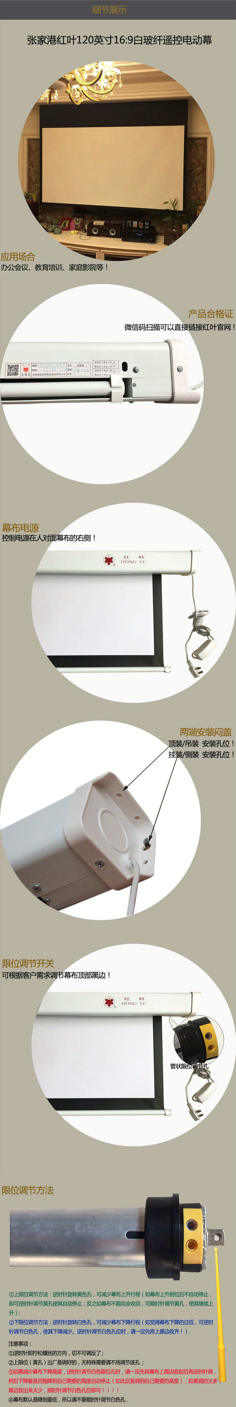 张家港红叶电动投影幕100寸16:9白塑白玻纤灰玻纤豪华吸顶天花幕