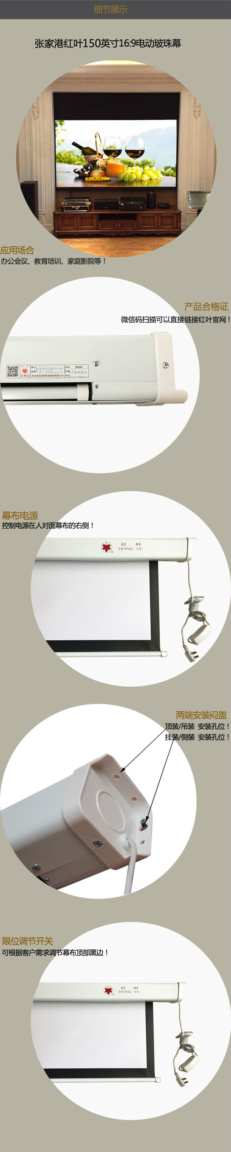 商品名称:Redleaf红叶电动投影仪幕布135寸150寸16:9白塑幕玻珠幕高清家用商用幕布3D高清影院电动幕