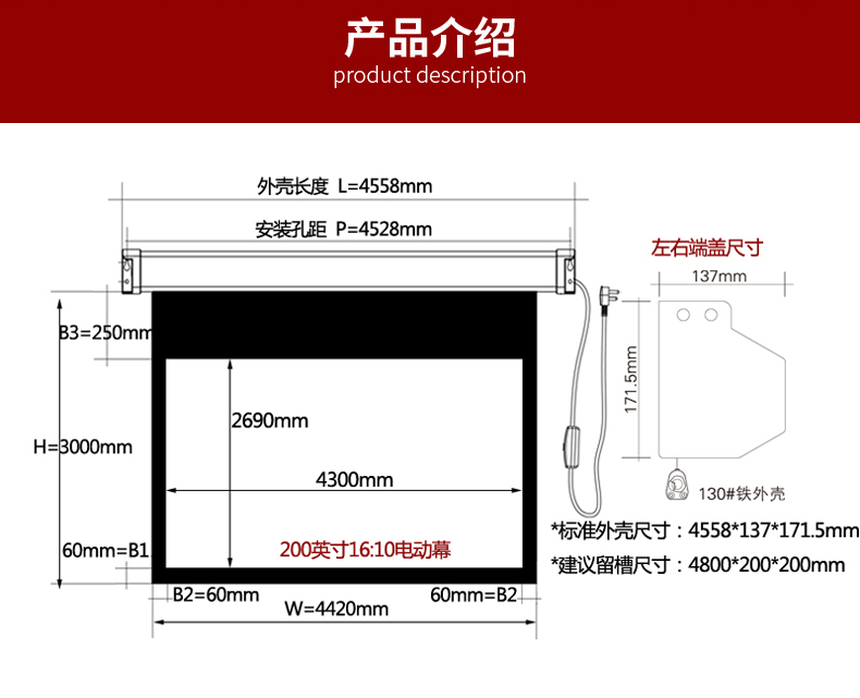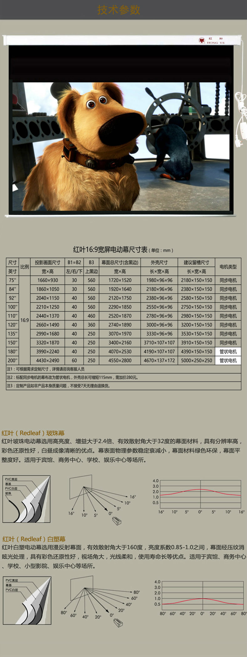 商品名称:Redleaf红叶电动投影仪幕布200寸16:9 16:10白塑幕玻珠幕高清家用幕布