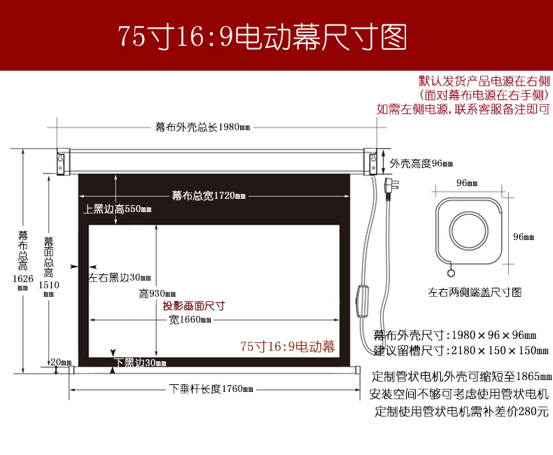 商品名称:Redleaf红叶电动投影仪幕布75寸84寸92寸16:9白塑幕玻珠幕高清3D家用商用投影幕家庭影院幕布